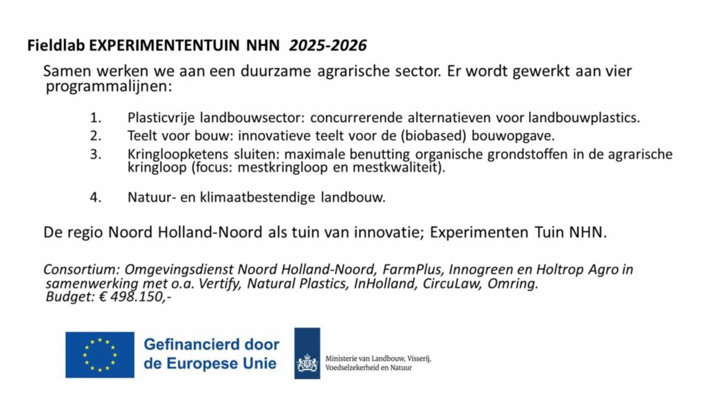 W.N. Kramer B.V. | Bloembollenbedrijf H. Kruijer | Klaverkaas | J&T Bruin Bloembollen | Gebroeders Hulsebosch | Green Balance Berkhout | Loonbedrijf Blankendaal | Neefjes Tulpen | CONO | Swaag | Blokker | Vertify | Omgevingsdienst NHN | ROM InWest | Greenport NHN | Vertify | J. van Bodegom | Gitzels B.V. | Inholland | WUR | LTO Westfriesland |Ā Natural Plastics | Circulaw | Omring | Noordwest Ziekenhuizen