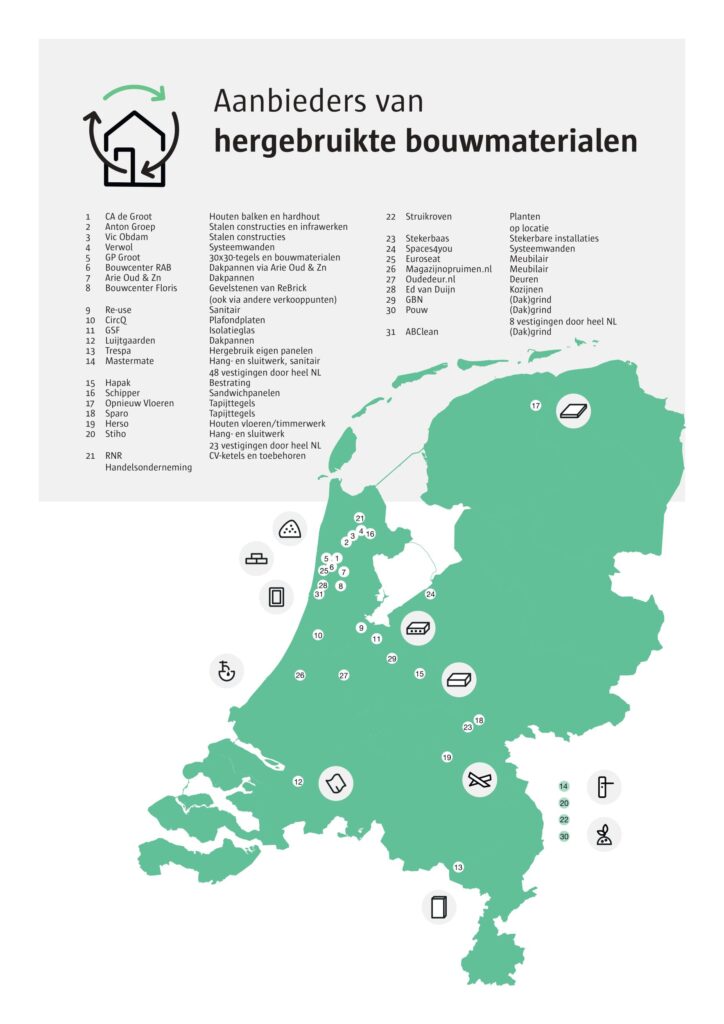 * Materialen die niet direct opnieuw gebruikt worden, belanden bij specialisten die de materialen weer opwerken, zodat andere projecten ze kunnen afnemen.
